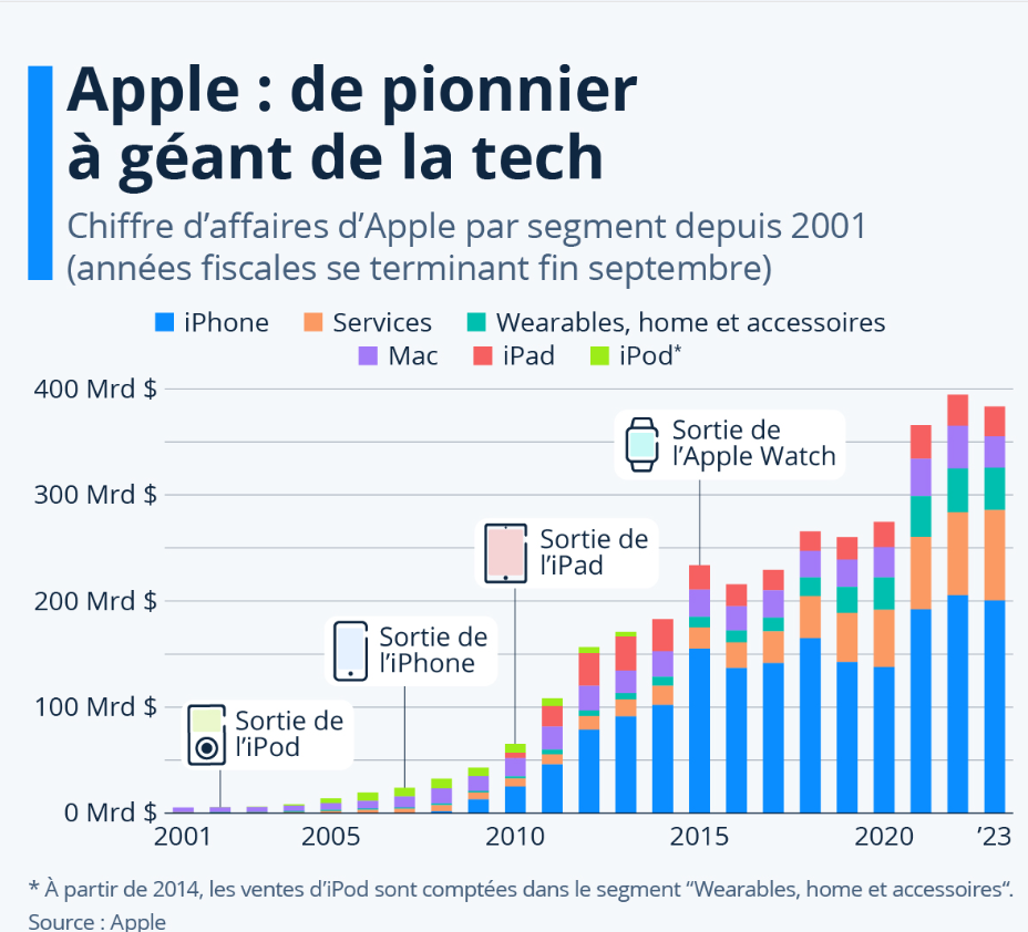 - Statista. Apple : de pionnier à géant de la tech par Valentine Fourreau, 15 mai 2024 : https://fr.statista.com/infographie/25752/chiffre-affaires-apple-par-segment-evolution-depuis-2001/#:~:text=Si%20Apple%20domine%20toujours%20les,rapport%20%C3%A0%20l’ann%C3%A9e%20pr%C3%A9c%C3%A9dente.